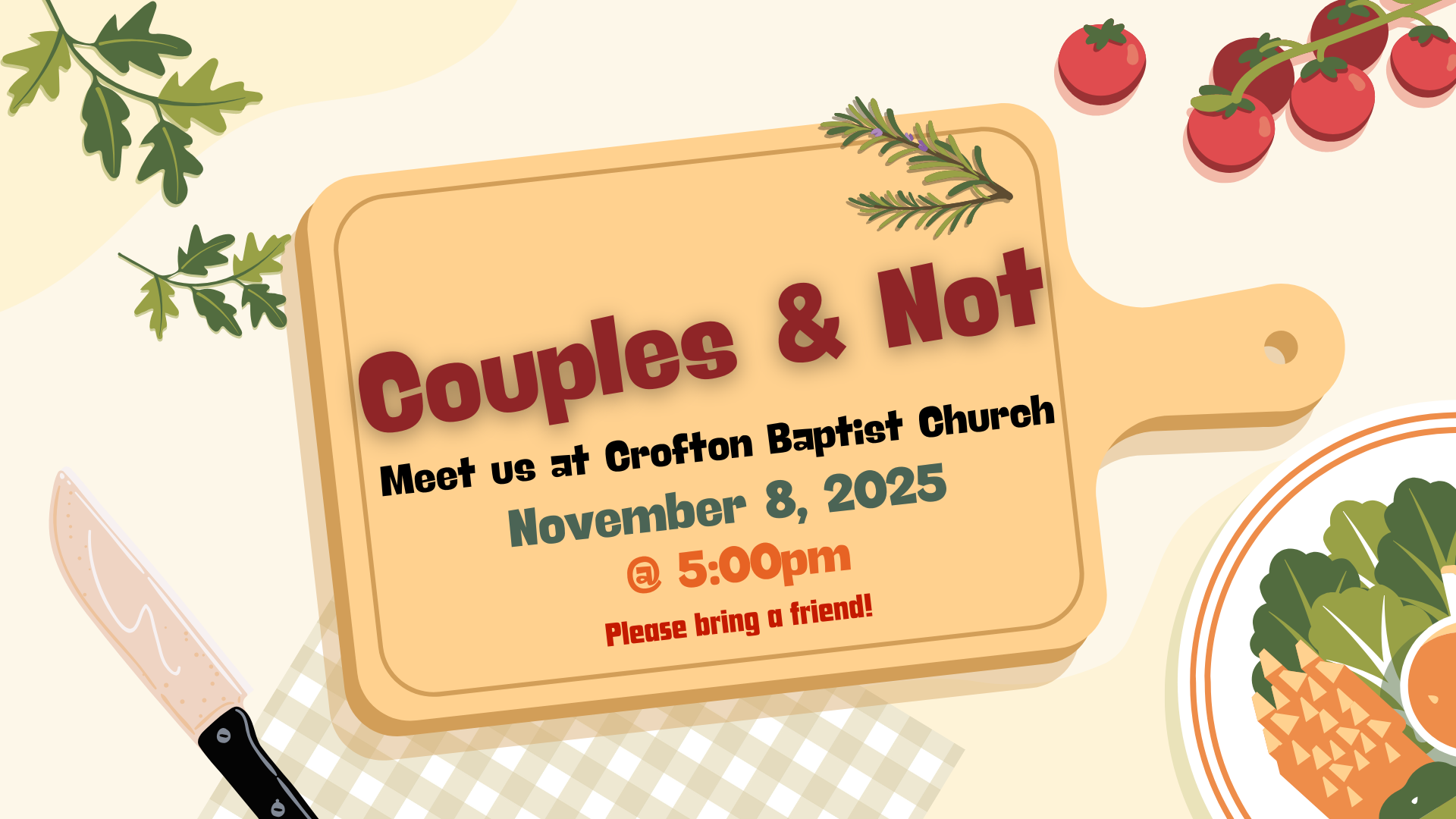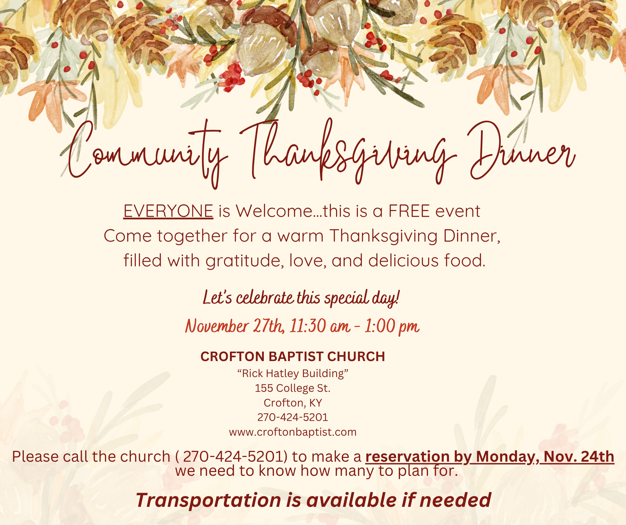 Meet at Crofton Baptist Church, where we will take the van and carpool to IDK Family Restaurant in Powderly Kentucky. If you choose to drive yourself meet us at the restaurant at 6:00pm: 137 Copper Creek Drive Powderly, KY For more questions call Janet: 270-836-8579 |